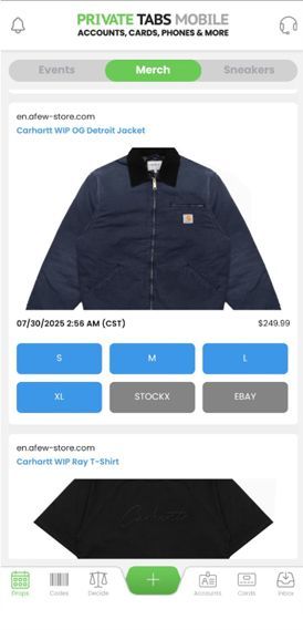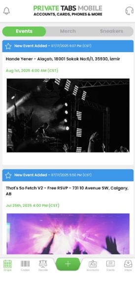 Track all drops, events, merch, sneakers, straight from the Private Tabs Mobile app. With easy views and one-tap access, you’ll always be ready to grab the win, no matter where you are.